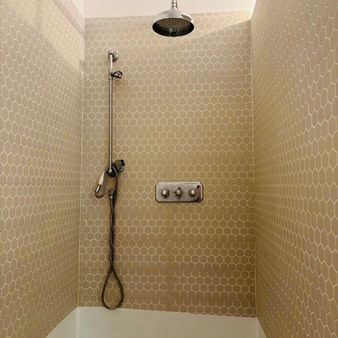 Une salle de bain privative composée d'une douche , un vasque et toilette